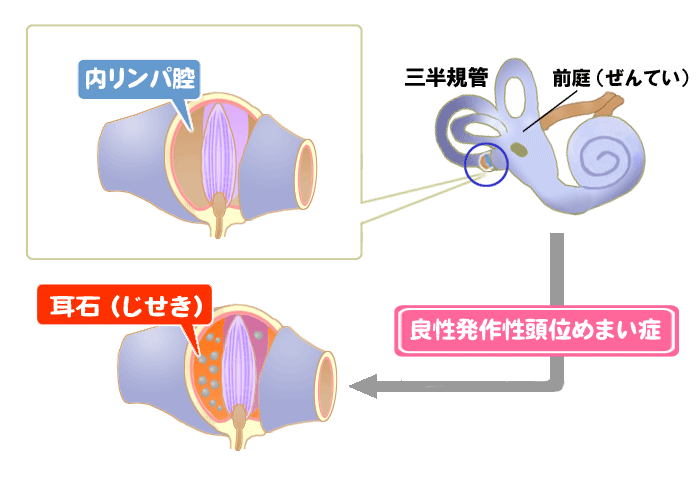 内耳(ないじ)の前庭(ぜんてい)という場所にある耳石(じせき)がはがれ、からだのバランスを保つ器官である三半規管(さんはんきかん)に入り込んでしまうとめまいが起こります。