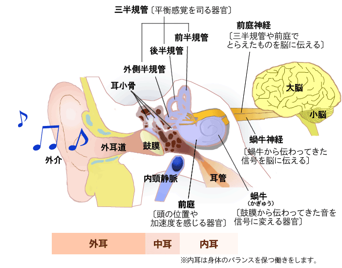 耳は音を聞く働きのほかに、からだのバランスを保つ働きもあります。