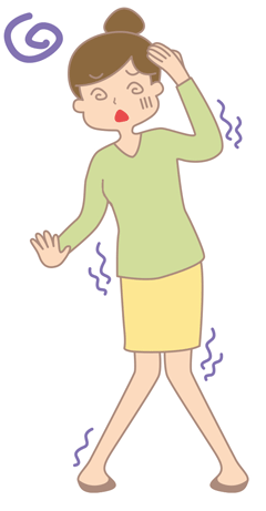 視界がボヤーッとする、気が遠くなる、嘔吐、上肢のしびれ感を伴うことが多くあります。難聴や耳鳴りを伴うことはほとんどありません。