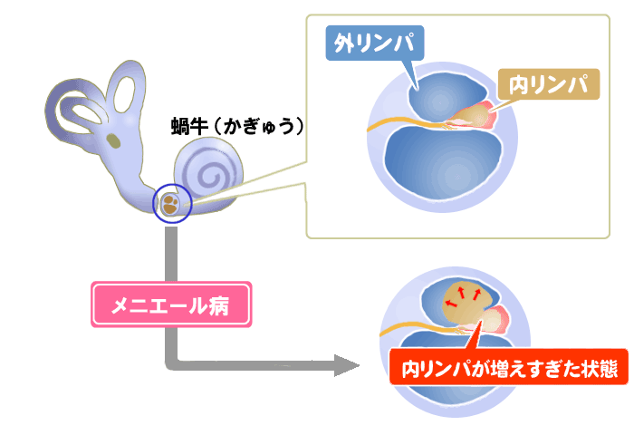 内耳(ないじ)を満たしている液体である「内リンパ」が増え過ぎると内耳がむくみ、めまいが起こります。